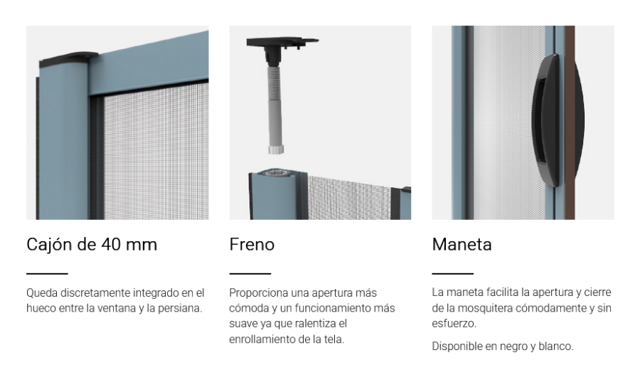 Es la mosquitera enrollable por excelencia. Su estudiado diseño con cierre automático, freno incorporado y tela antimosquitos de primera calidad proporciona la máxima comodidad en su uso, al tiempo que reduce al mínimo el impacto estético en la vivienda. Una mosquitera que aporta toda la protección que necesitas sin que notes su presencia.