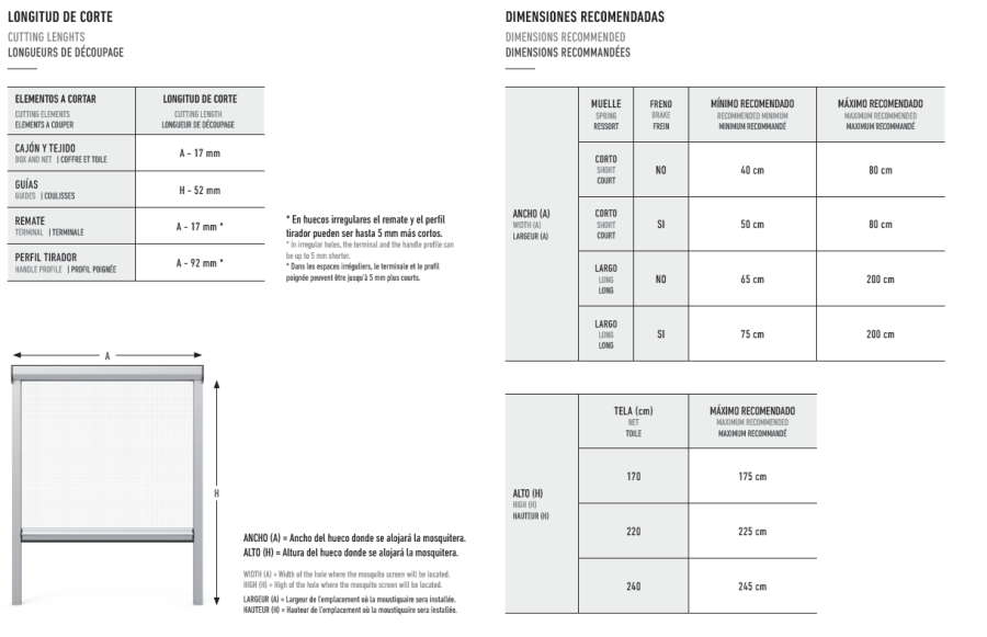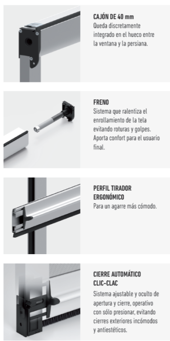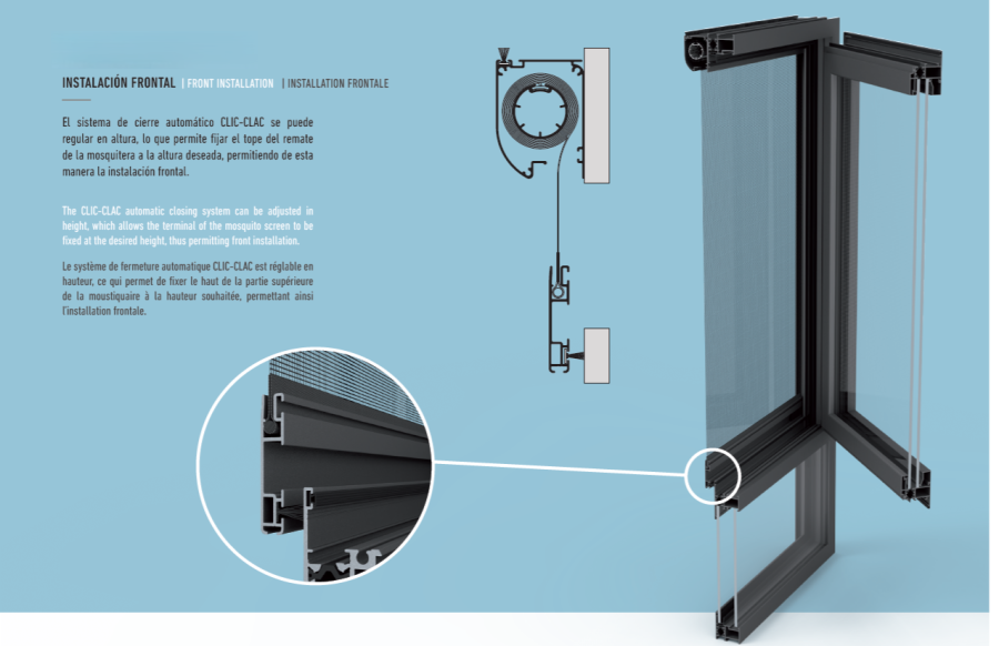 El sistema de cierre automático CLIC-CLAC se puede regular en altura, lo que permite fijar el tope del remate de la mosquitera a la altura deseada, permitiendo de esta manera la instalación frontal.
