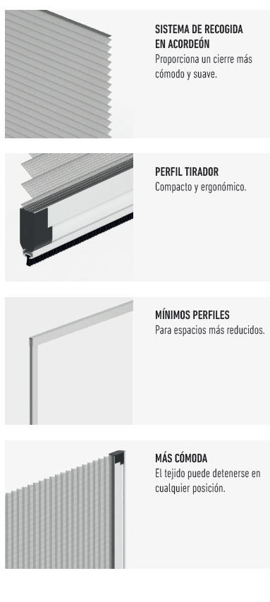 La Plisada Mini es una mosquitera para puertas y ventanas que destaca por su singular estética e innovador sistema de recogida en acordeón,