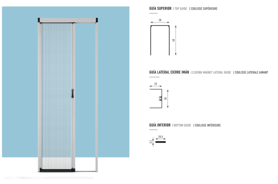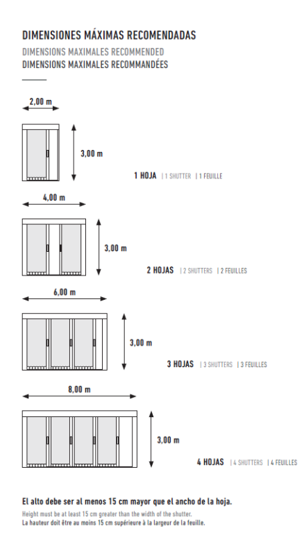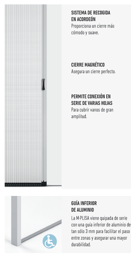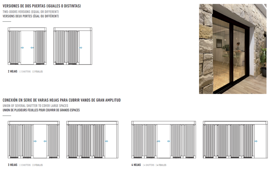 Destaca también su cierre magnético, la maneta, el perfil y la guía inferior de menos de 3 mm de altura, la cual facilita un paso más accesible. Permite la conexión en serie de varias hojas, de forma