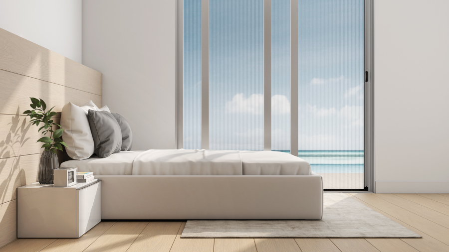 La mosquitera Plisada destaca por su singular estética y su innovador sistema de recogida lateral en acordeón, que proporciona un cierre muy cómodo y suave, pudiendo detener el tejido en cualquier parte de la apertura.