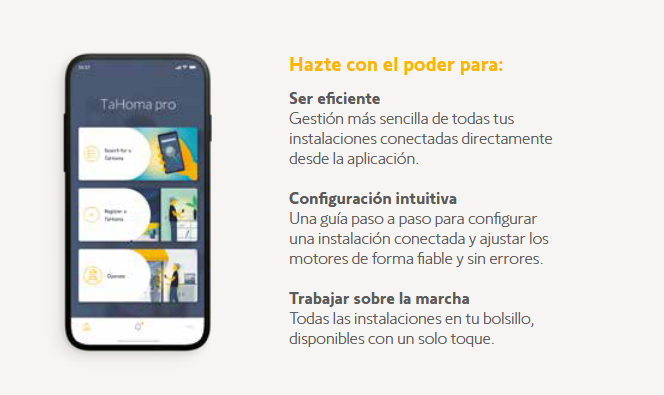 La instalación de equipos motorizados es el primer paso para hacer tu vida más cómoda y confortable. Añadir conectividad aporta valiosas ventajas gracias a la centralización y a todo el poder de TaHoma. Ahora los equipos conectados son fáciles de vender.