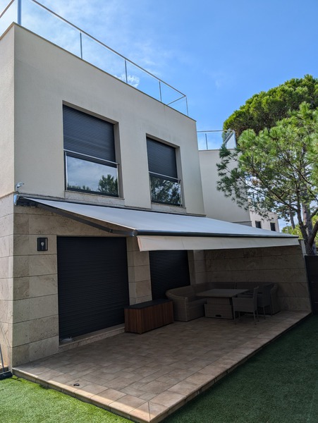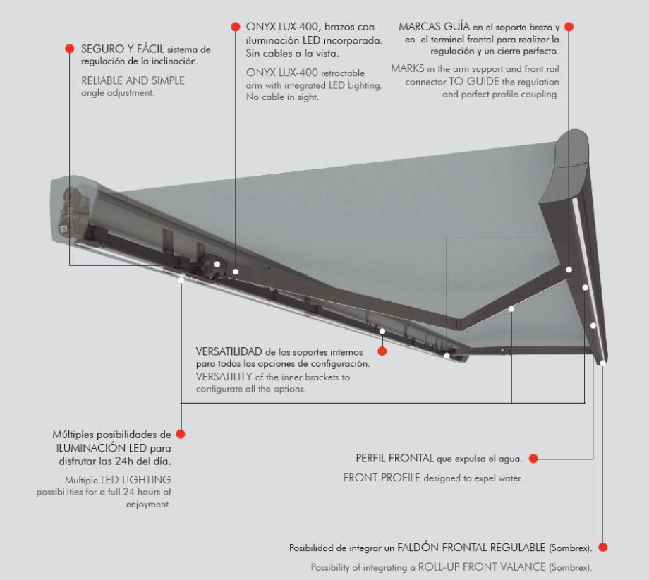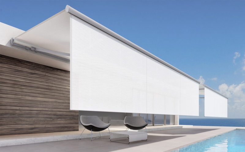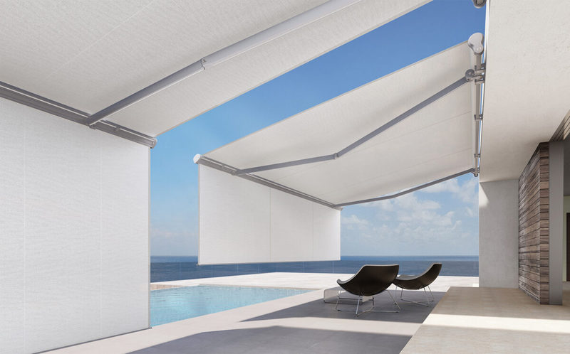 El sistema MODULBOX-400 permite incorporar el SOMBREX en todas las opciones de configuración. Este faldón enrollable optimiza las prestaciones del producto ya que aporta mayor protección solar incluso cuando la posición del sol es baja en el horizonte. Otra ventaja de incorporar un SOMBREX es la ganancia de privacidad para disfrutar más plenamente del espacio exterior.