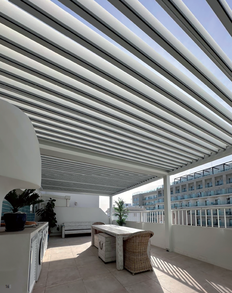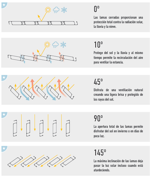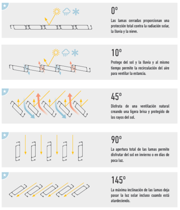 Con sólo pulsar un botón podrás crear tu propio microclima regulando la cantidad de luz, sombra y ventilación deseada en cada momento.