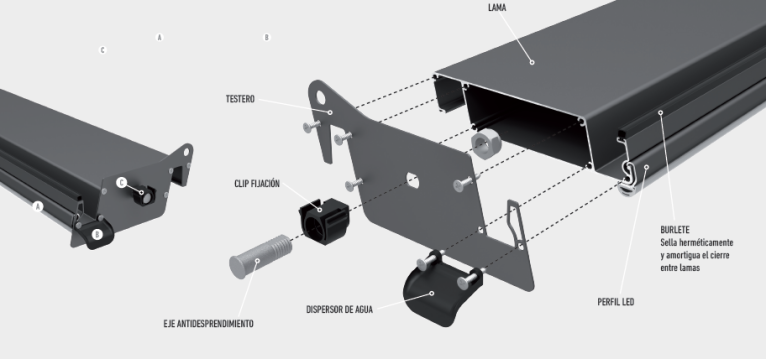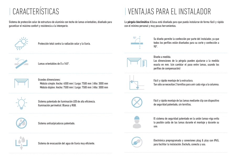 La pérgola bioclimática Klima cuenta con numerosas soluciones patentadas, creativas e innovadoras cuyo desarrollo ha sido realizado por nuestro departamento de I+D+i, con la premisa principal de ofrecer las mejores prestaciones, hacer más fácil y segura su instalación y brindar el mayor confort y seguridad al usuario. El sistema de iluminación LED de alta eficiencia , el sistema antisalpicaduras y el sistema antidesprendimiento son prueba de ello.