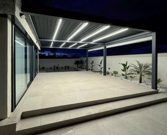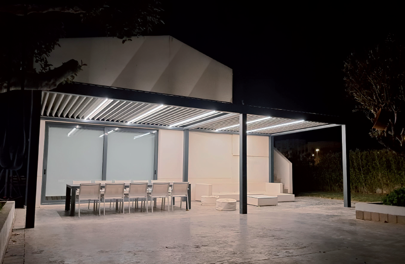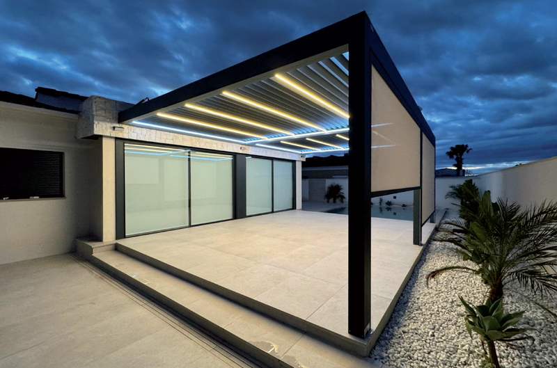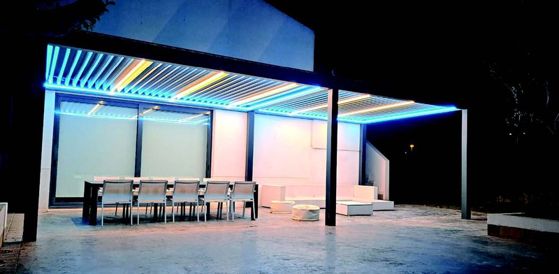 La nueva bioclimática se distingue por su innovador sistema patentado de iluminación LED, el cual permite mantener siempre altas relaciones de lux independientemente de la posición de las lamas.