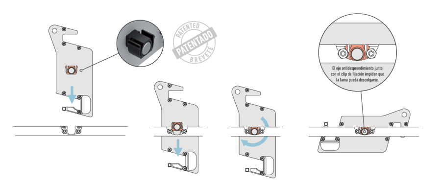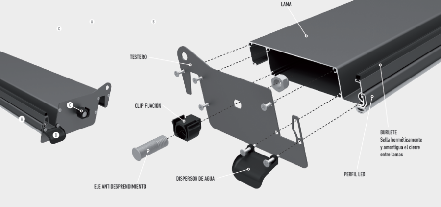 La seguridad tanto en el montaje como en su uso ha sido una de las mayores obsesiones de nuestro departamento de i+D a la hora de diseñar la pérgola bioclimática. El clip de fijación junto con el eje antidesprendimiento facilitan el montaje de las lamas, a la vez que una vez fijadas a la viga, evitan que la lama pueda desprenderse y al mismo tiempo aporta rigidez estructural al conjunto de la pérgola.