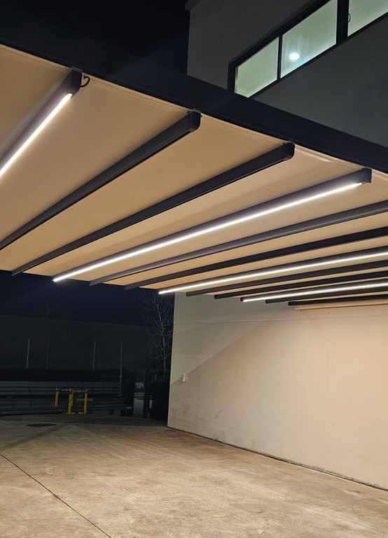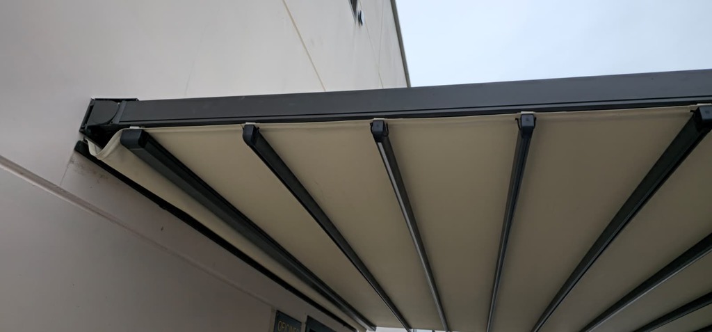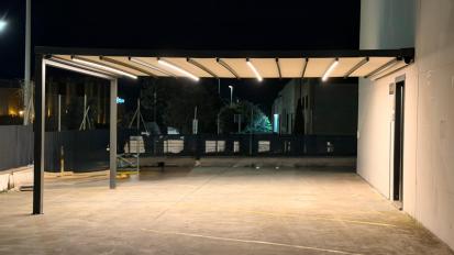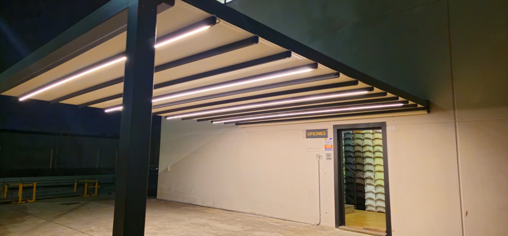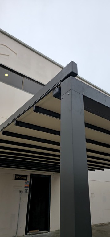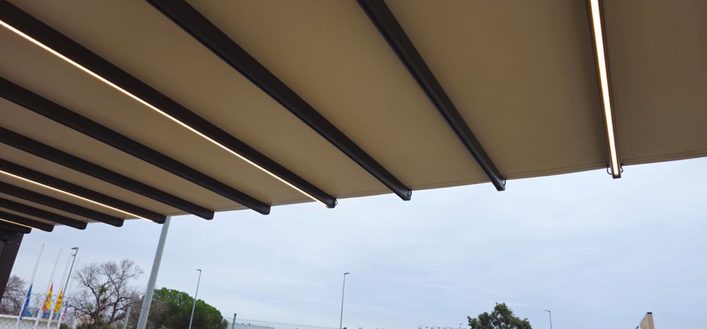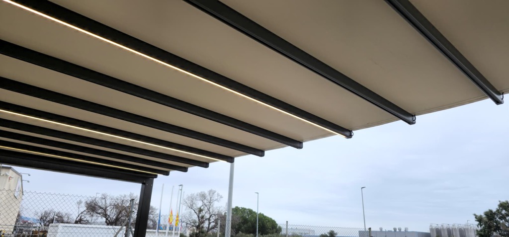 Pérgola tensada plana con desagüe libre, diseñada para ofrecer resistencia y una evacuación eficiente del agua.
